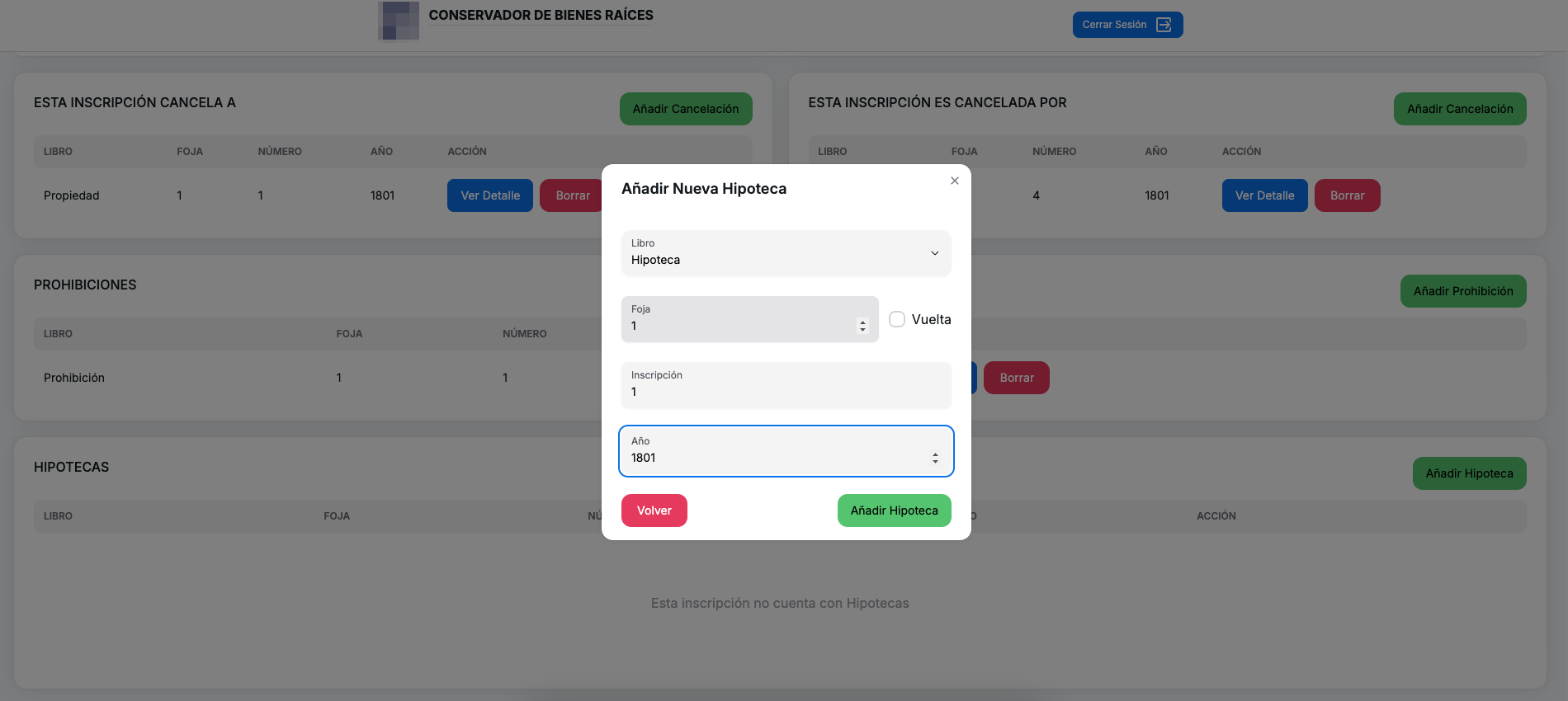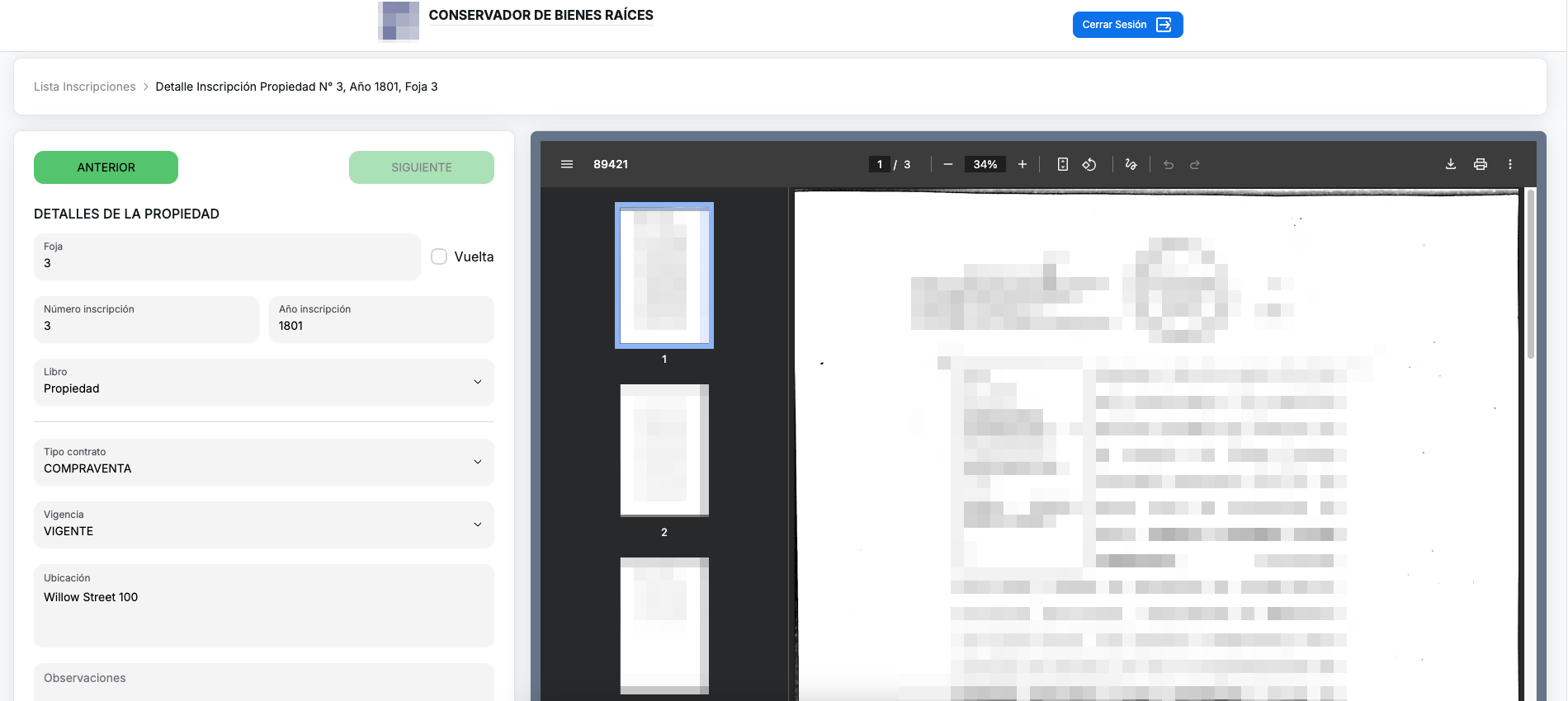 Gestión de Conservador de Bienes Raíces es un sistema orientado a la digitalización y manejo de los registros de conservadores de bienes raíces en Chile. La plataforma permite llevar un registro detallado, por año y por libro, de los índices de propiedad, gravamenes de hipotecas y prohibiciones, junto a sus respectivas relaciones. Asimismo, almacena información sobre los propietarios, constituyentes y beneficiarios vinculados a cada inscripción.