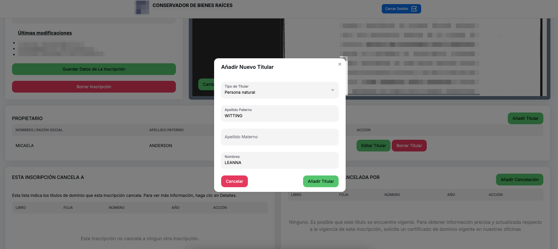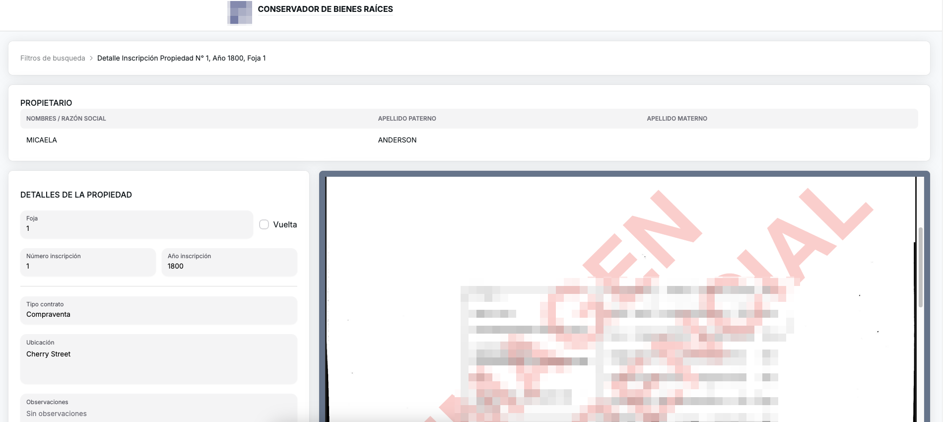 Cuenta con una interfaz de usuario robusta e intuitiva, que facilita la búsqueda de títulos y gravamenes utilizando filtros de búsqueda avanzada como; titular, razón social, libro, numero de foja, numero de inscripción, entre otros criterios.